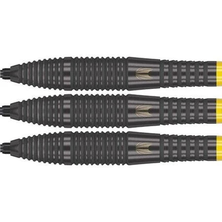 Gyda gorchudd titaniwm du syfrdanol am haen ychwanegol o wydnwch ac estheteg well, mae'r gafael rhigolau rheiddiol wedi'u chwythu â thywod yn caniatáu mwy o reolaeth gan roi'r hyder i chi daflu gyda chywirdeb manwl gywir. Wedi'u peiriannu ar gyfer manwl gywirdeb, mae'r casgenni twngsten 90% yn cael eu hategu gan y siafftiau Pro Grip poblogaidd a hediadau rhif 6 Bolide Void, ac wedi'u gorffen gyda Phwyntiau Swistir du patent 26mm Target ar gyfer dart cwbl gyfnewidiadwy.