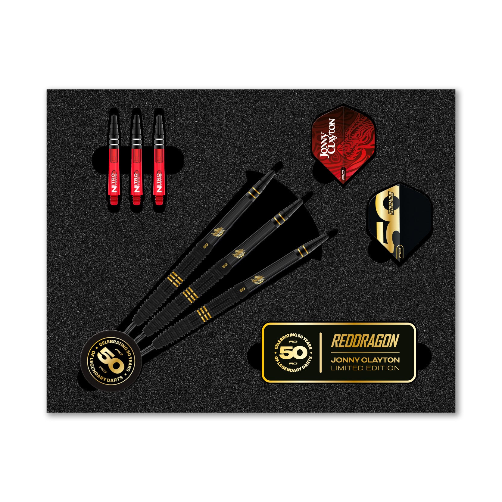 Jonny Clayton – 50 Year Limited Edition Dart Jonny Clayton’s throw is unmistakable: fast, fluid, and ferociously accurate. The playing dart that has sparked Jonny’s resurgence in 2025, has been reimagined with a stealthy black Onyx finish fused with rich 24-carat detailing.