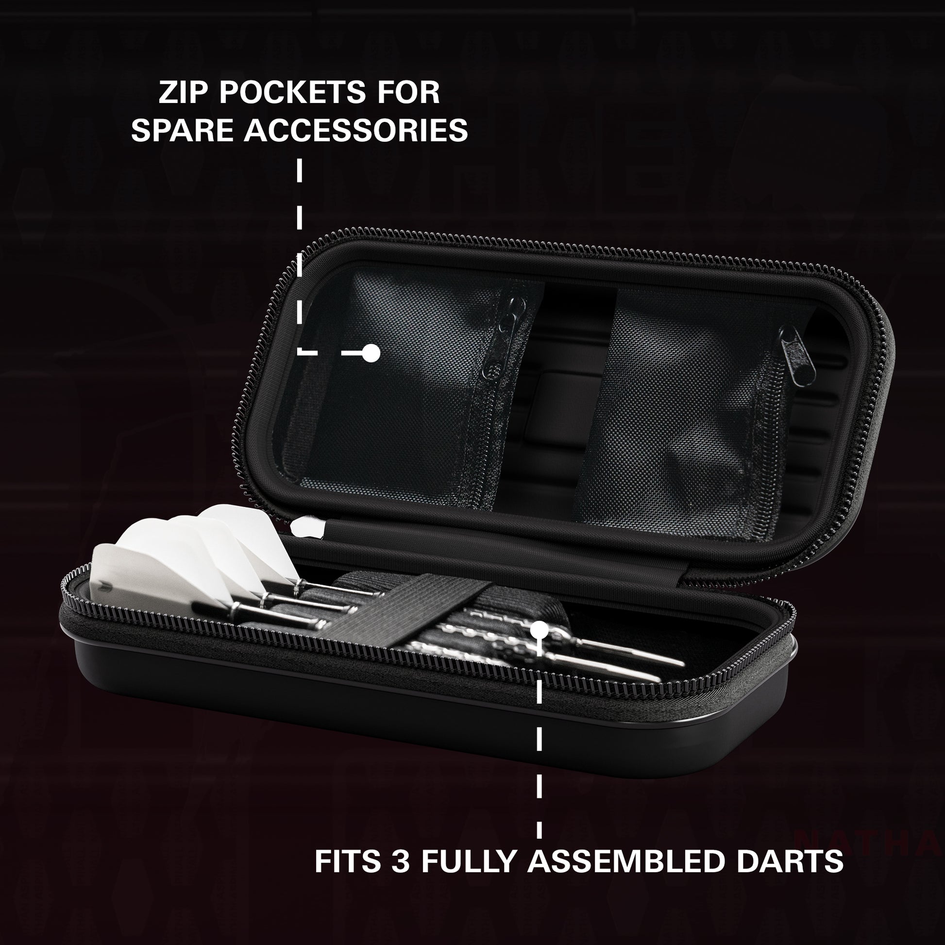 Constructed with a durable hard shell, the Takoma keeps your darts safe and protected. The scratch-resistant interior lining secures 3 fully assembled darts, while zip pockets provide space for additional accessories such as spare flights, shafts, Swiss Points, or your Swiss Point tool — combining style and practicality in one premium case.