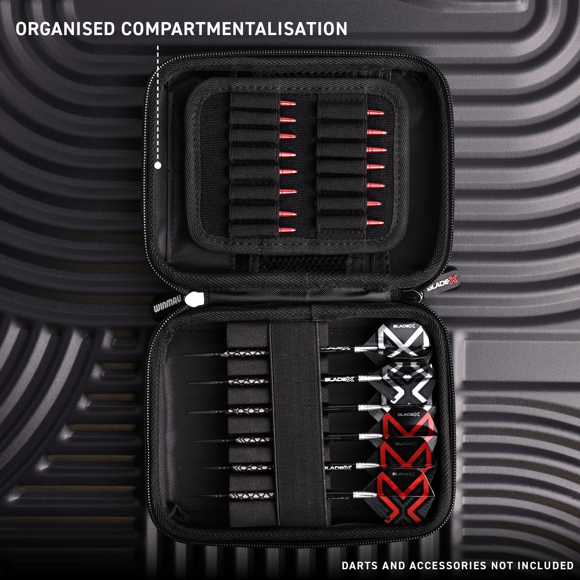 Engineered to hold two sets of fully assembled darts, plus dedicated pockets for flights and dedicated pockets for shafts, it keeps your entire setup secure and organised. The ultra-modern, robust construction offers maximum protection against impact and wear - perfect for players on the move.