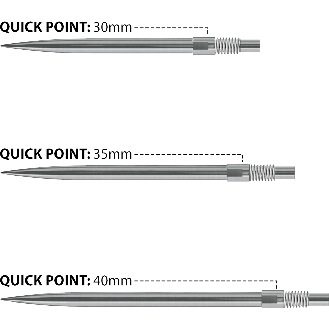 Initially available in 30mm, 35mm, and 40mm lengths, and in sleek silver or black finishes, Quick Points let you fine-tune your darts to match your game.