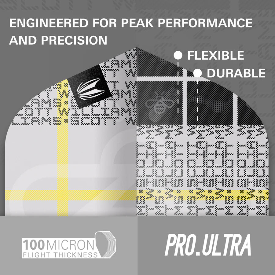 Designed in conjunction with Scott Williams’ Generation 2 darts, these official player flights feature his bold black, grey, and yellow plaid pattern, featuring his signature branding. A tribute to Scott’s dynamic on-stage presence, they reflect the style of the 2024 World Championship Semi-Finalist and rising force on the PDC tour.